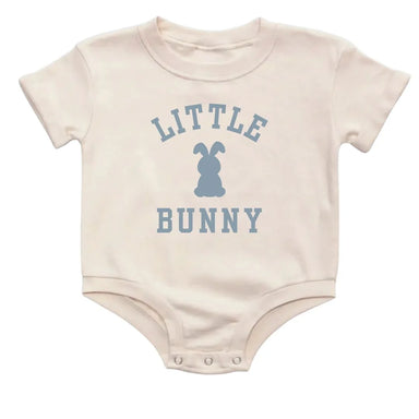 Your little one will be the cutest cottontail in town wearing this charming natural romper! Featuring an adorable steel blue bunny across the front...