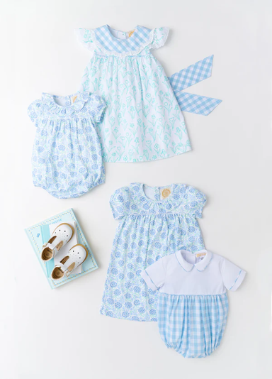 Blooming with charm, the Ramona Ruffle Bubble in Handful of Hydrangeas with Worth Avenue White is a garden-inspired delight. This girls' bubble rom...