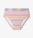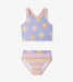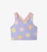 This two-piece brings glittery soft lavender hues and cheerful vibes to every outing. The top features a playful sun print, with some suns showing yellow rays and an orange center, and others the reverse for a fun mix of colour. Pink, yellow, and grey stripes add a bright touch to the bottoms and matching crisscross back straps. The stretchy material keeps kids comfortable as they swim and play, and quick-dry performance makes transitions from water to towels smooth and easy. It also holds up against chlorine and saltwater to stay bright and reliable.