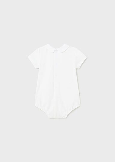 This cream-colored long-sleeved T-shirt for boys features delicate embroidered details and a round neckline. A snap button at the collar simplifies...
