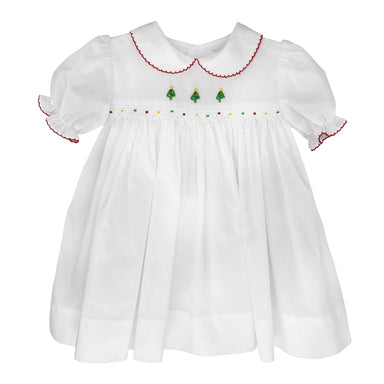 This adorable short sleeve dress comes in a white batiste fabric with an embroidered bullion Christmas tree design on the front. Edges are trimmed ...