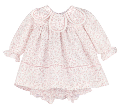 This Rose Pink Dress for baby girls features a delicate petal collar, long sleeves with ruffled cuffs at the sleeves and a charming pattern with br...