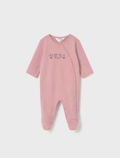 This pink snap footie features charming embroidered jungle animals on the front, designed for baby girls. Crafted for comfort and ease, it includes...