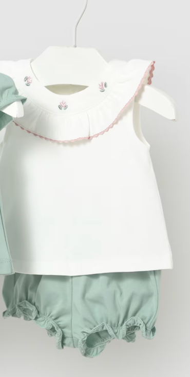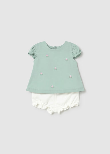 This adorable two-piece set brings spring style to life with a soft green tee featuring delicate pink embroidered flowers that dance across the che...