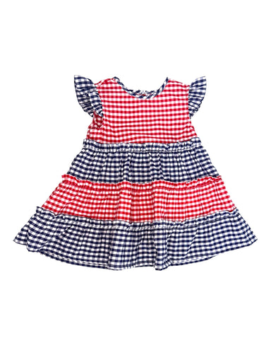 Adorable red and navy gingham tiered dress designed for little girls who love classic charm. Featuring ruffled sleeves that add a playful touch and...