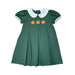 This charming green dress features delicate pleats and intricate crochet pumpkin accents, perfectly capturing a festive autumn spirit. Designed with a classic Peter Pan collar edged in bright orange scallops, it adds a refined touch to your little girl's wardrobe. Ideal for seasonal celebrations, this dress combines timeless style with playful details for a comfortable and elegant look.