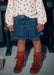 This playful pleated dark denim skirt combines style and comfort with an adjustable elastic waistband featuring inside buttons for a perfect fit. Made from soft, durable denim, it’s ideal for everyday adventures. Front pockets add a fun, functional touch, making it a go-to favorite for any little girl’s wardrobe