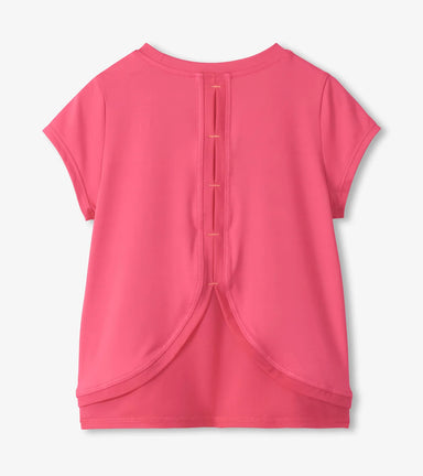 Help her stay cool and confident in this tee! This lightweight cap-sleeve top is crafted from a stretchy polyester-spandex blend for ease of moveme...