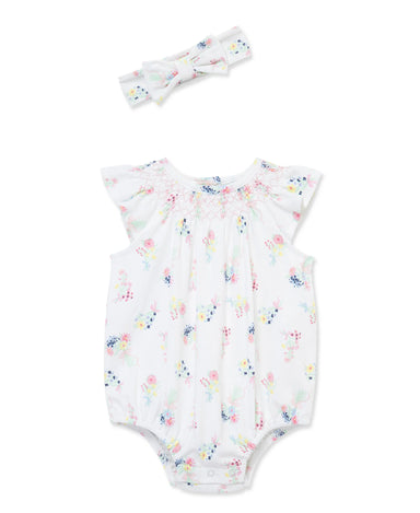 Dress your little one in pure sweetness with this charming smocked bubble featuring a delicate white floral bouquet print. Crafted from 100% soft c...