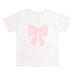 Meet the perfect tee for little ones who love a touch of whimsy! This adorable white shirt features a charming pink bow graphic that's sure to brighten any day. Crafted from soft 100% cotton, it's gentle on delicate skin and built for comfort. The tagless neck label means no itchy tags to fuss over—just pure comfort for all-day wear. True to size with a unisex toddler fit, it's easy to care for too. Simply machine wash inside out and lay flat to dry. A sweet staple that pairs with everything in her wardrobe!
