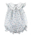 Adorable bubble romper designed for little ones who love to bloom! This charming piece features a soft blue floral print with varying shades of blue throughout. The sweet white scalloped collar adds a classic touch, while ruffled sleeves and a ruffled hem create playful movement with every giggle and crawl. Perfect for playdates, photos, or everyday adventures—this bubble is as cute as it is comfortable for your baby girl.
