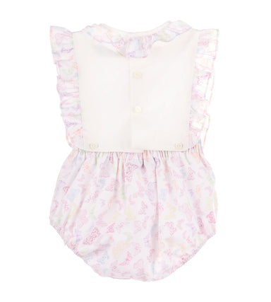 Adorable bubble overall featuring delicate pastel butterflies that flutter across the fabric. Soft ruffles frame the neckline and sleeves for an ex...
