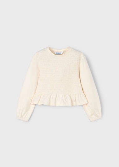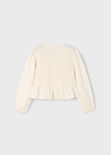 This cream-colored long-sleeved top for girls features elasticated cuffs and delicate smocking with honeycomb detailing, adding texture and charm. ...