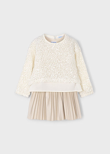 This playful cream sweatshirt dress combines comfort and style with long sleeves and a cozy round neckline. The skirt boasts a fun pleated design w...