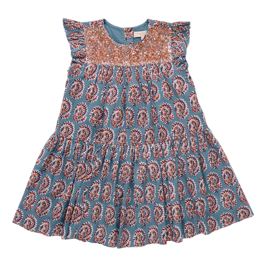 Flower Power! Pink Chicken's Girls Charlie Dress glows with scattered oversized blooms in warm gem tones against a cream ground in our eye-catching...