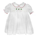 This adorable short sleeve dress comes in a white batiste fabric with an embroidered bullion Christmas tree design on the front. Edges are trimmed with red stitching and embroidered string of lights dots on the front add the perfect amount of detail.