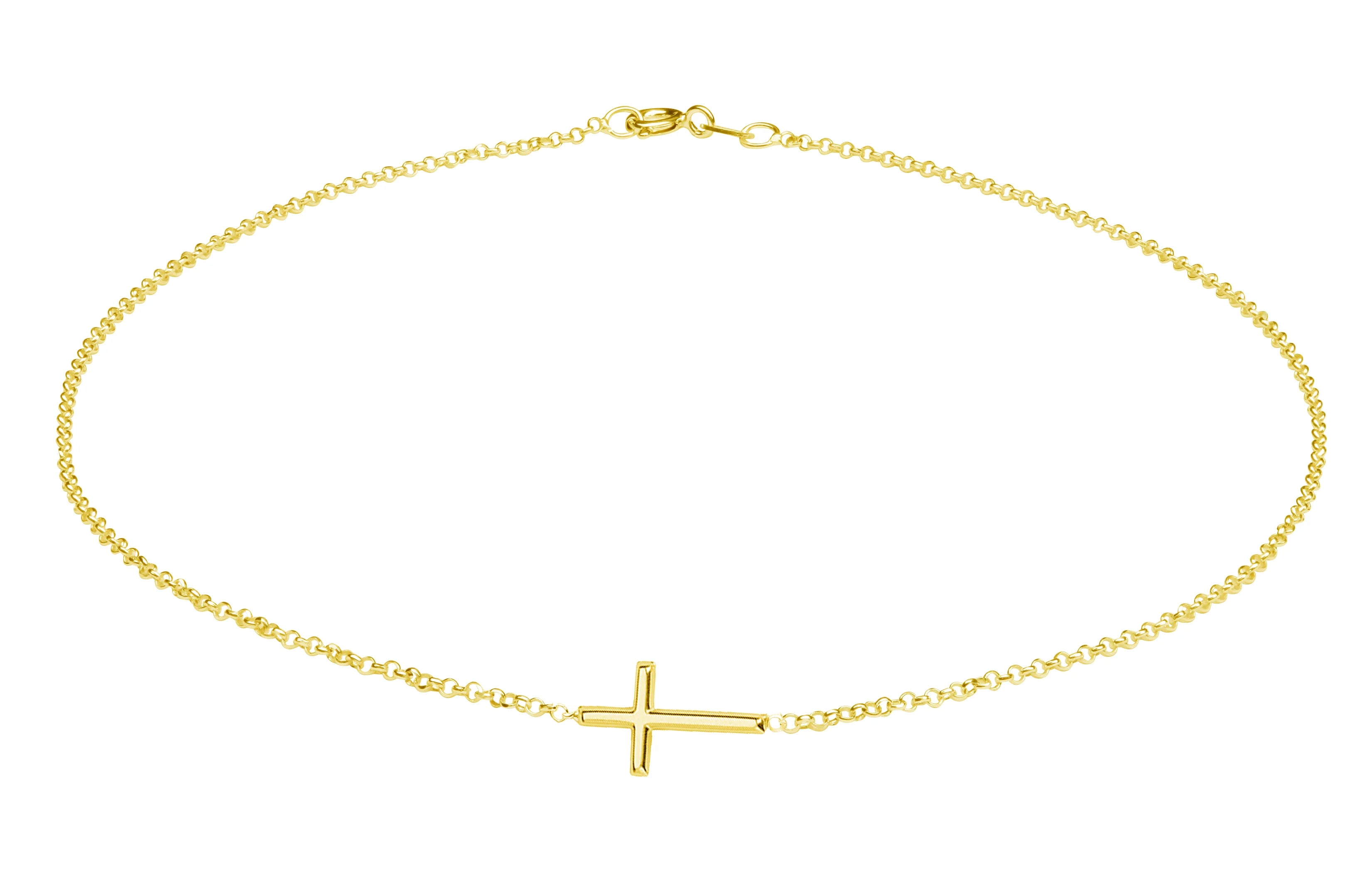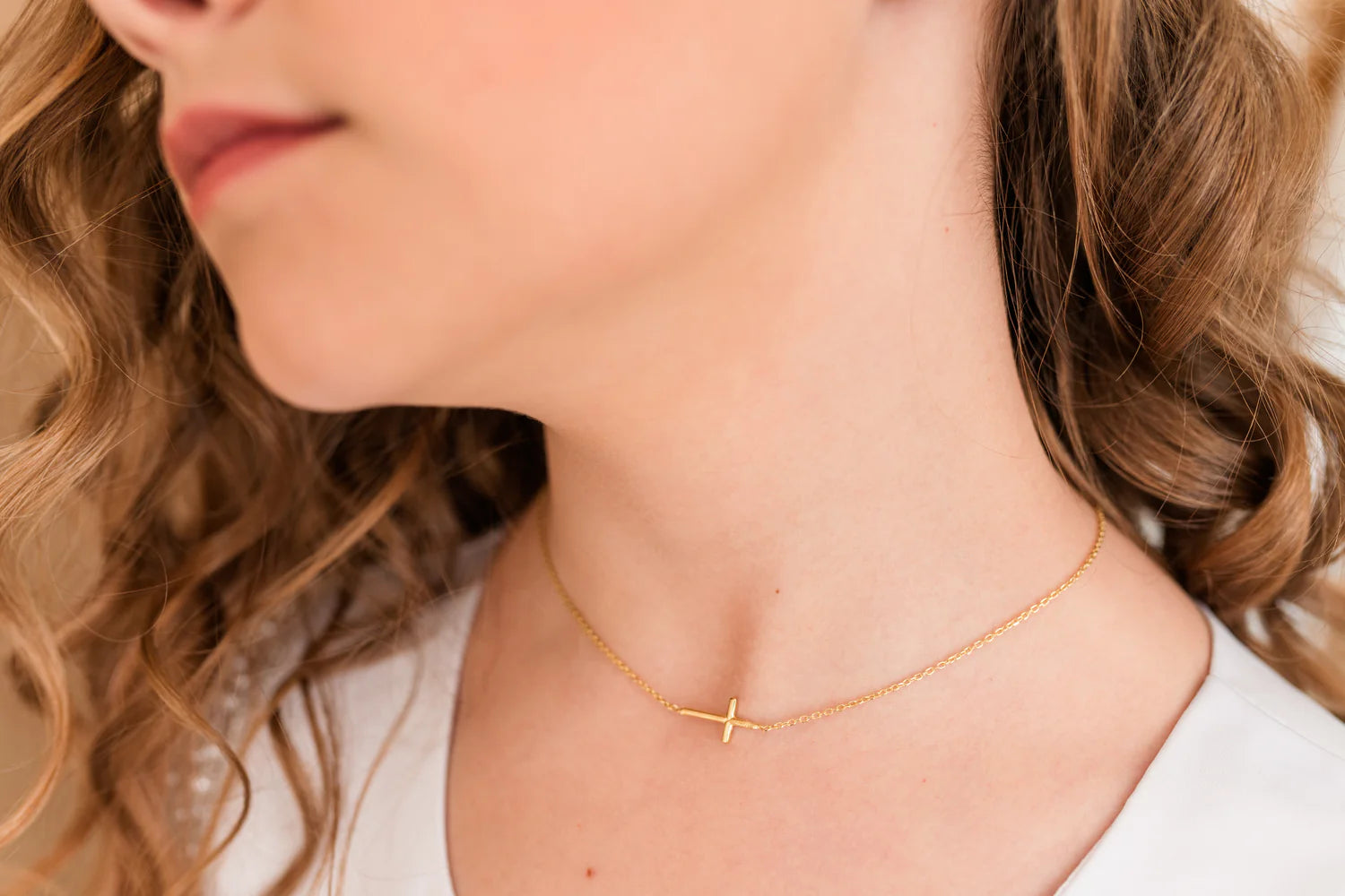 Stunning 14K gold-plated horizontal cross necklace with dainty cross accented in the center (15x8mm). These are created with sterling silver and plated with 14K gold. This trending necklace is designed and produced in Italy from top designers and have a special anti-tarnish coating applied to prevent tarnish keeping them looking shiny and bright.