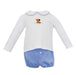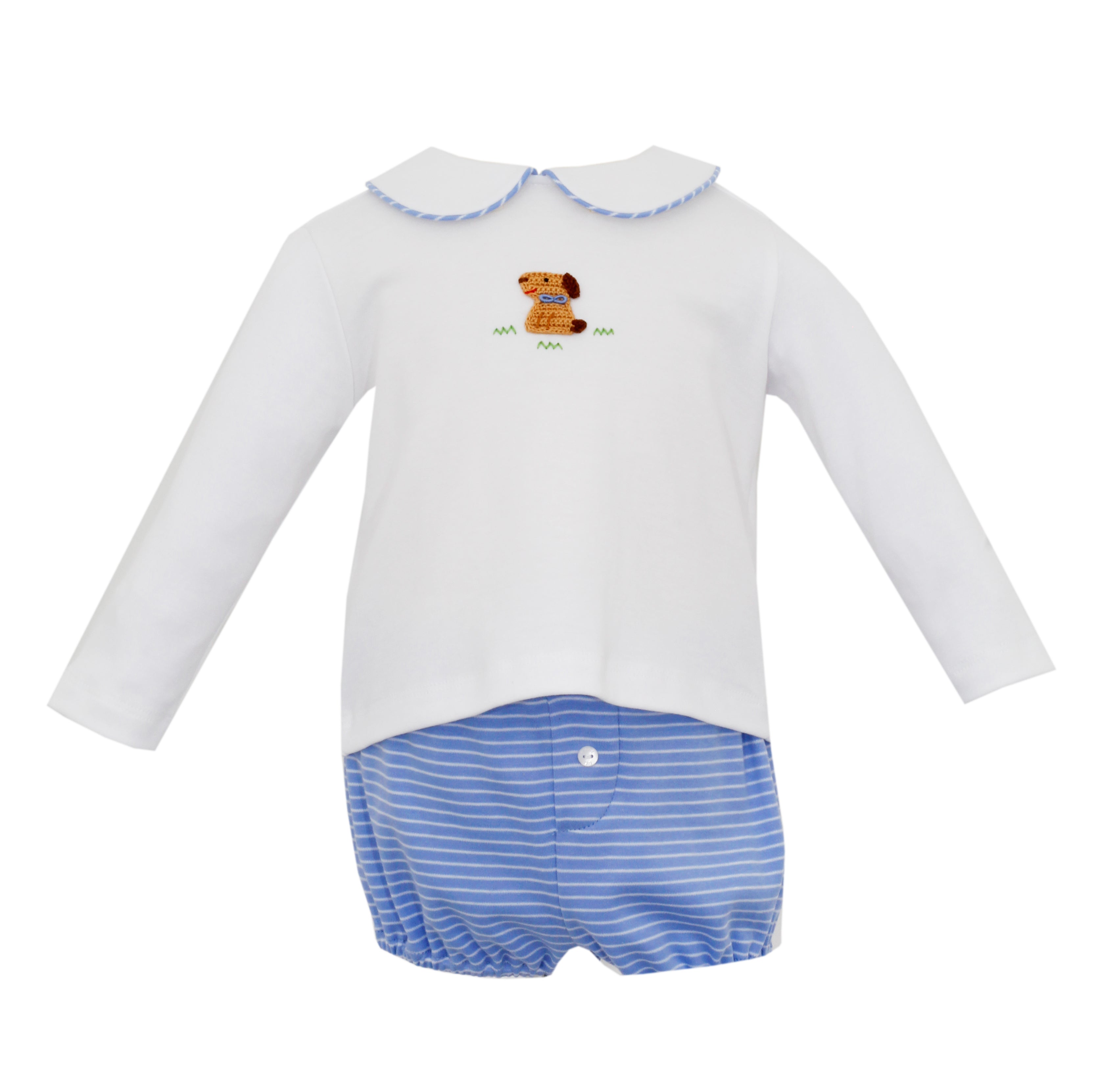 White knit long sleeve top with a Peter Pan collar and a crochet puppy at the front. Blue with white stripe Diaper cover with an elastic waistband.
