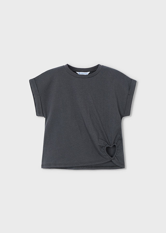 This charcoal tee features a subtle peekaboo heart accent near the hemline which adds a touch of playfulness to any outfit!