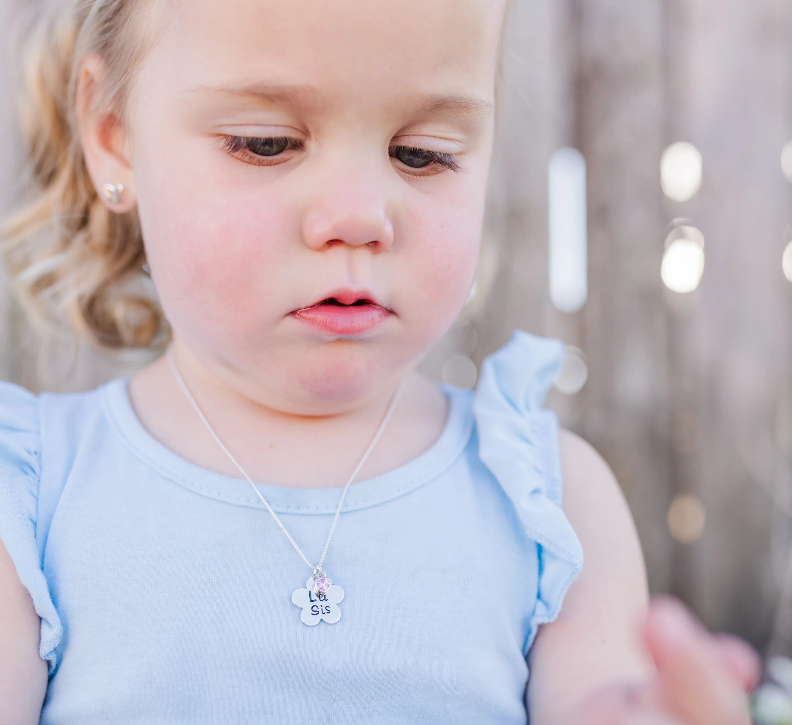 Adorable Sterling Silver "Big Sis" daisy flower charm necklace with pink sparkling heart accent on a 14" Italian Chain. What a special gift for new Big Sisters!