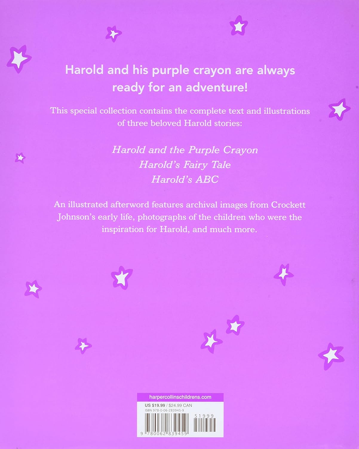 Now fans old and new can experience the magic of Harold in three creative adventures. A treasury including the full text and illustrations from the cherished Harold and the Purple Crayon, Harold’s Fairy Tale, and Harold’s ABC, this collection makes a beautiful collector’s item and gift.
