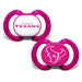 Looking for a way to soothe your little Houston Texans fan? Look no further than these officially licensed NFL Houston Texans Pink pacifiers. The Orthodontic Silicone Nipple and plastic shield make them safe for your child's mouth, while the Team Logo And Colors on the "button" and shield respectively let everyone know who they're rooting for. These pacifiers have been quality and safety tested to be 100% BPA-free and are suitable for infants ages 3 months and up. To clean, use hot water and mild detergent and rinse thoroughly.