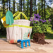 Machine washable for easy cleaning after a fun day in the garden, this white and green canvas tote has front and side pockets for holding gardening tools. Tools are secured with loops of rope, and an easy-grip handle makes this lightweight bag easy to pick up and carry around outside. Includes 3 colorful kid-sized gardening tools made of high-quality metal and FSC-certified wood. Each set includes an 8-inch shovel, a 6-inch hand rake, and an 8.5-inch trowel.