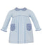 This charming long sleeve dress in a soft light blue shade features playful navy floral details on the front pockets, collar, and sleeve cuffs. Perfect for adding a splash of fun to her wardrobe, it combines cozy comfort with eye-catching style for every day of joyful play.