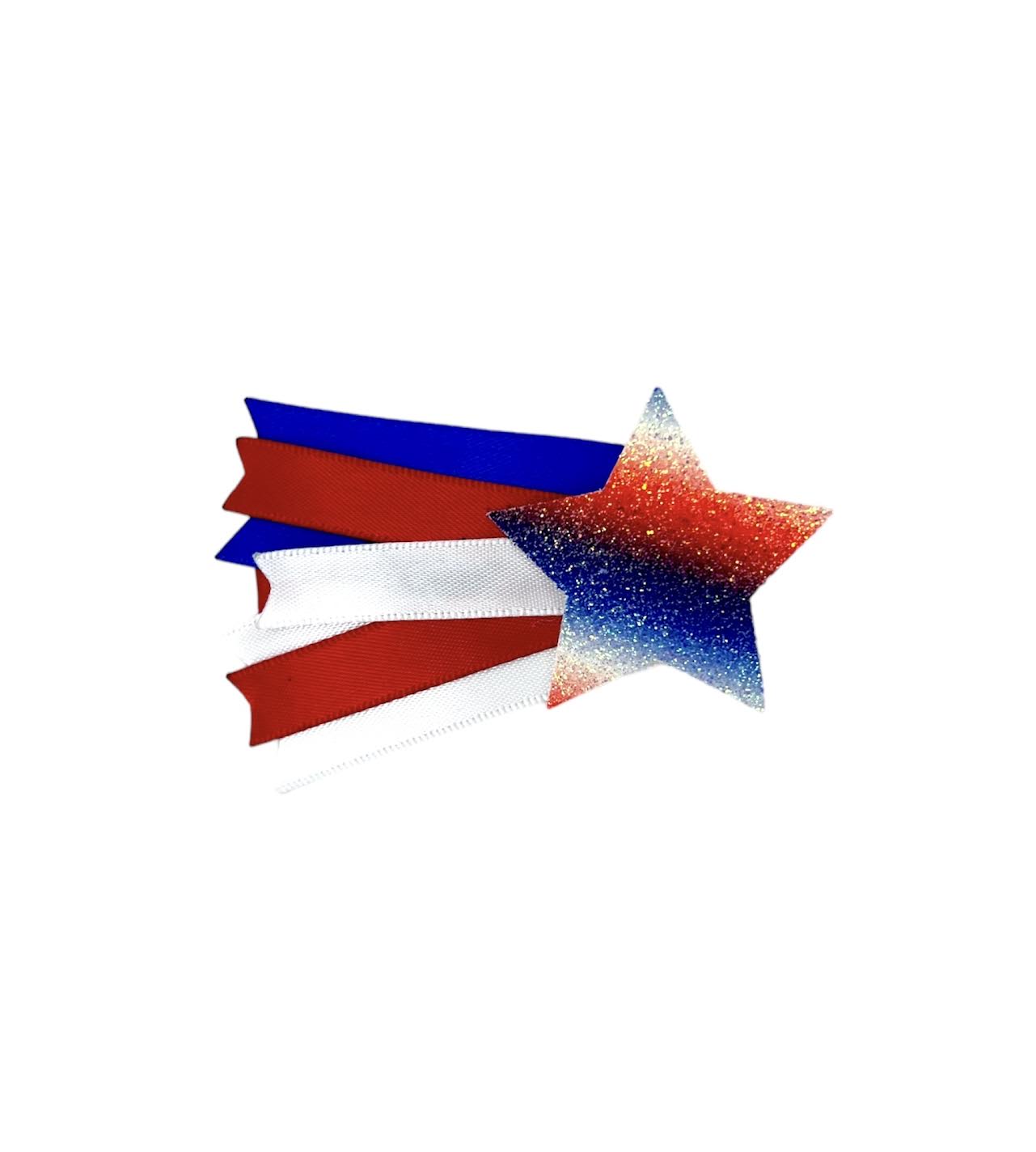 RWB glittery star with satin Royal, Red and White ribbon. Measures around 3" Long and 1.5" Wide.