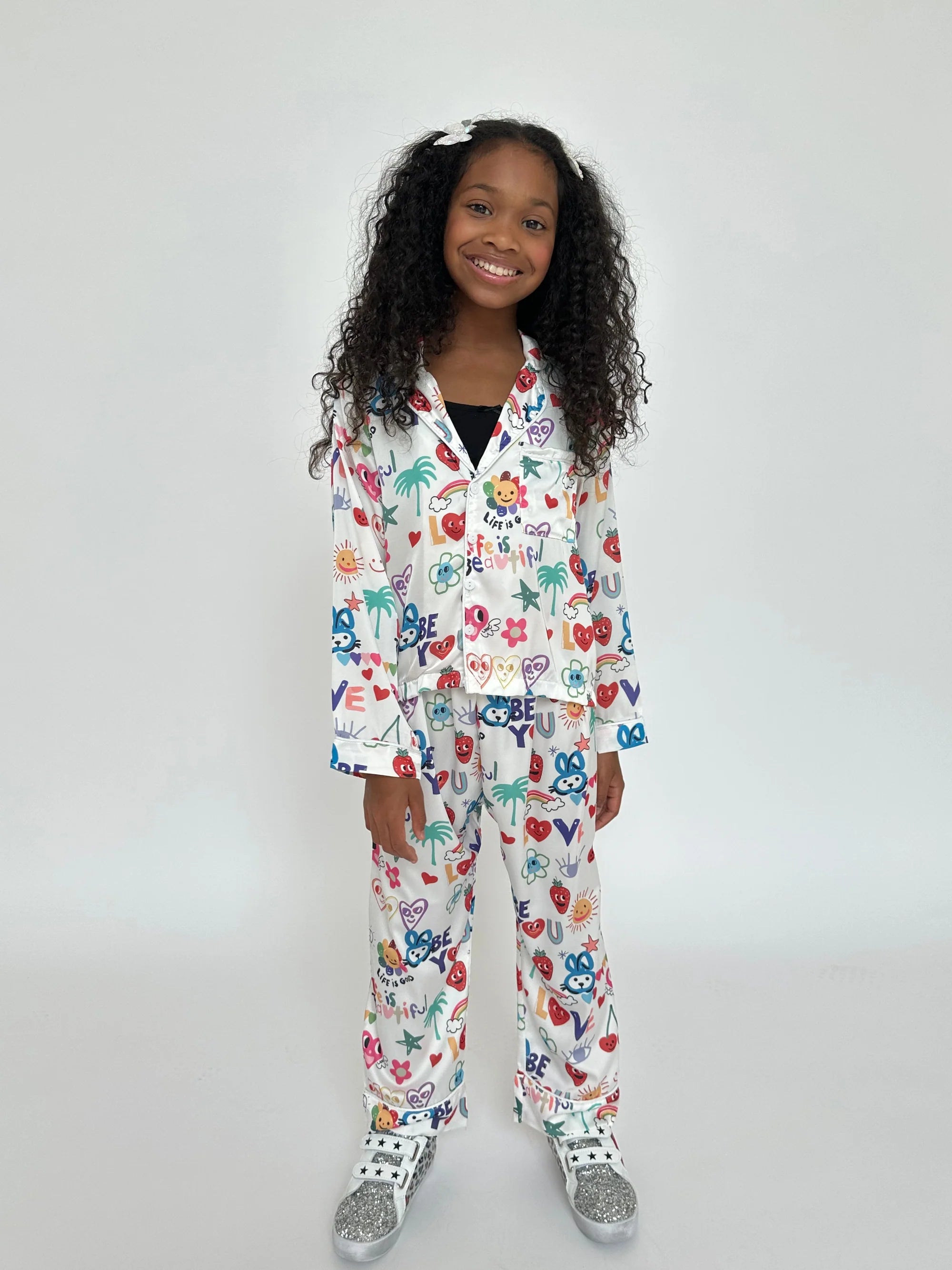 The set includes a long-sleeve button-up top with a classic collar and matching pants, perfect for cozy nights and relaxed mornings. Designed with an energetic and joyful pattern, this lounge set is ideal for sleepovers, lazy days at home, or any time you want to spread some good vibes.