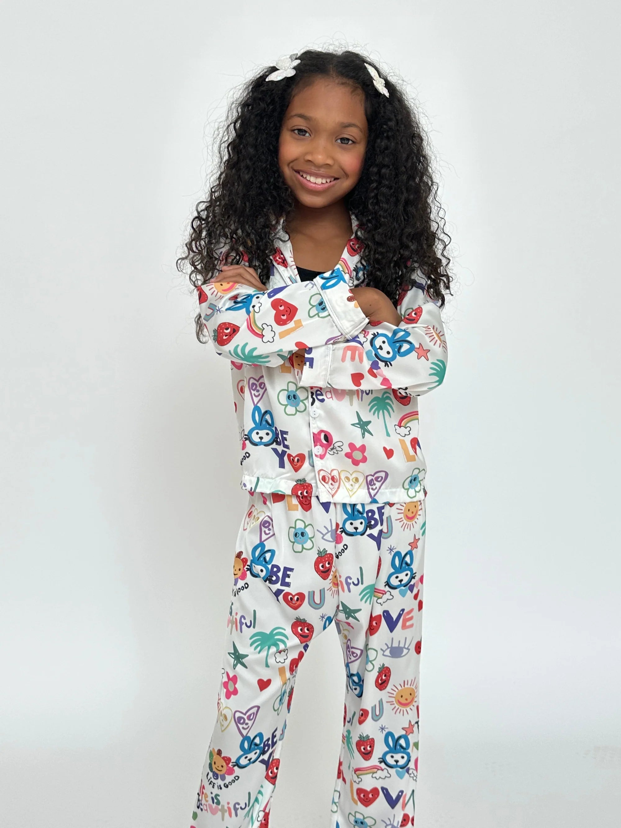 Playful and vibrant pajama set featuring a fun, colorful print filled with positive messages and cheerful designs. Girls' printed lounge set made from smooth, soft fabric that provides a comfortable and relaxed fit.