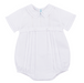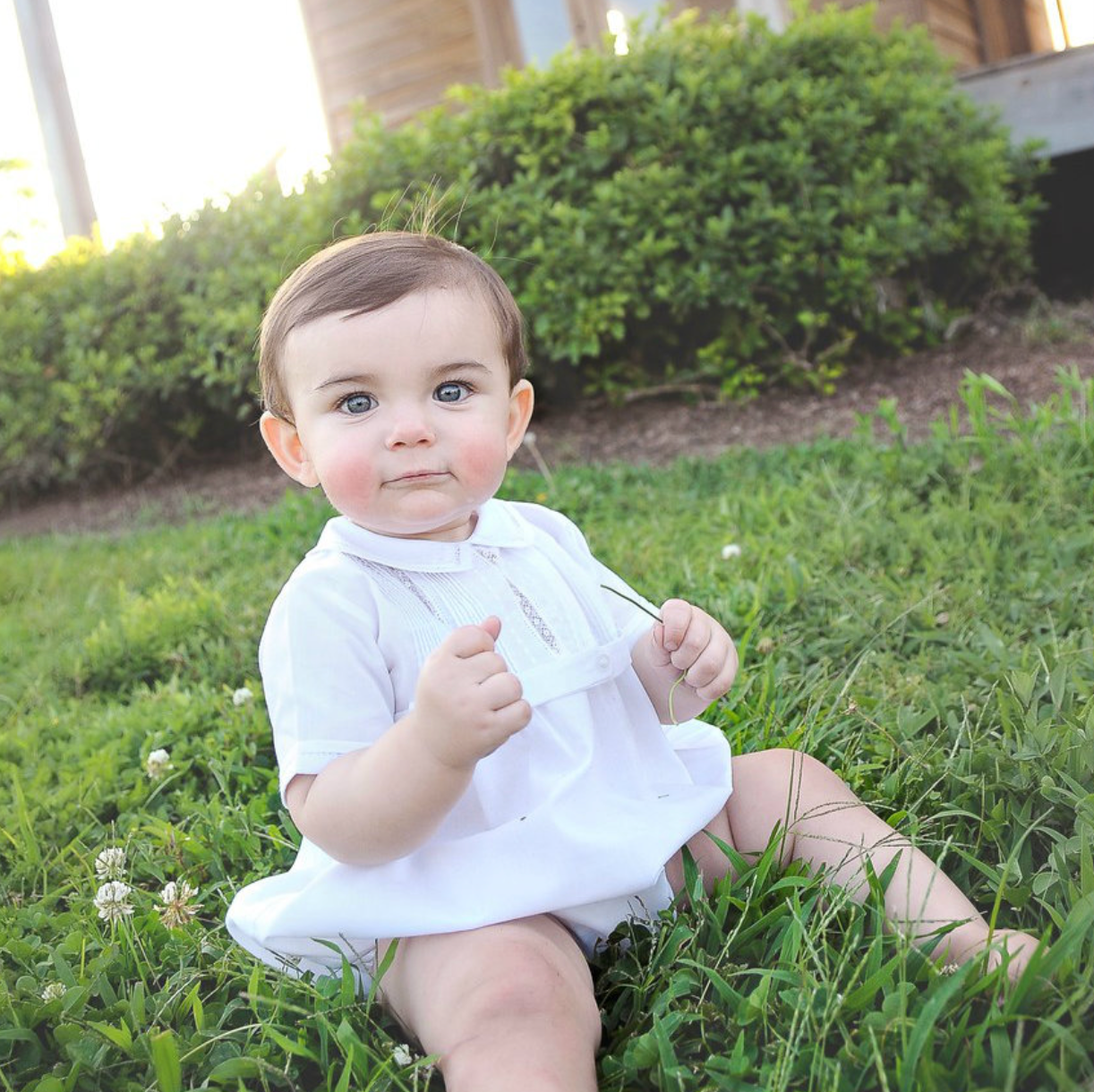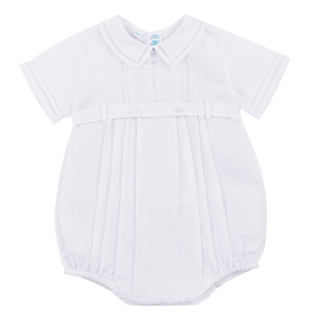 Breathtaking! This magnificent boys creeper is a masterpiece in detail. Delicate fagoting lines both the collar and cuffs of this piece, and the collar features subtle yet elegant embroidered leaves. The bodice has an exquisite design of pintucks inlaid with beautiful French lace and a hand embroidered dot design. Just below the waist lies a thin button belt which continues into sharp pleats until the bottom of the creeper. Opens with buttons on the back and snaps along the bottom for easy changing convenience. The perfect outfit to dress your little boy in for all special occasions, including religious events, holidays, and those special family times.